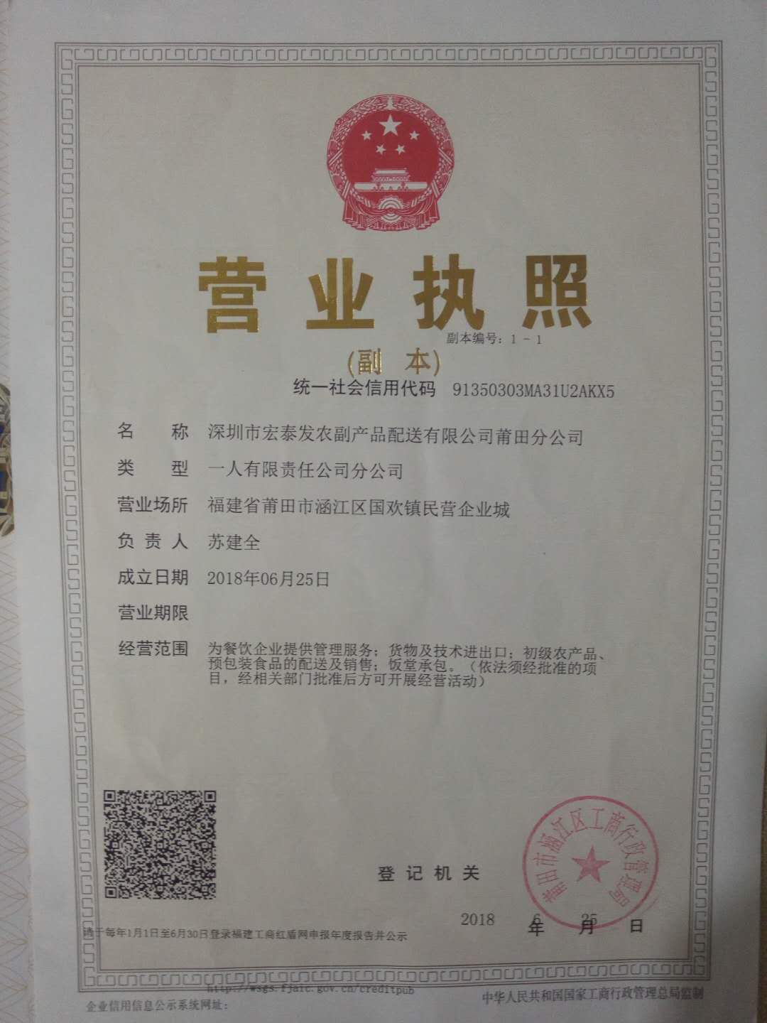 深圳市宏泰發農副產品配送有限公司莆田分公司是一家專業從事于農產品配送和飯堂承包的服務公司,主要客戶為工廠、酒樓、學校和企事業機關單位。